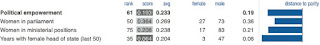 With regards to political empowerment the Gender Gap report has 3 criteria : Women in parliament, Women in ministerial positions, and Years with female head of state (over the last 50 years). At first, I thought they were under the impression that Queen Elizabeth was a dude. It turns out that by head of state they mean PM and not the Queen or Governor General. Second they are criticizing the choices women make to run or not and who women vote for. Third, you can get a grasp of the Gender Gap's line of thinking by noting the other data points they include : "Quota for women on candidate lists in national elections, Quota for women on candidate lists in local elections, Voluntary political party quotas."